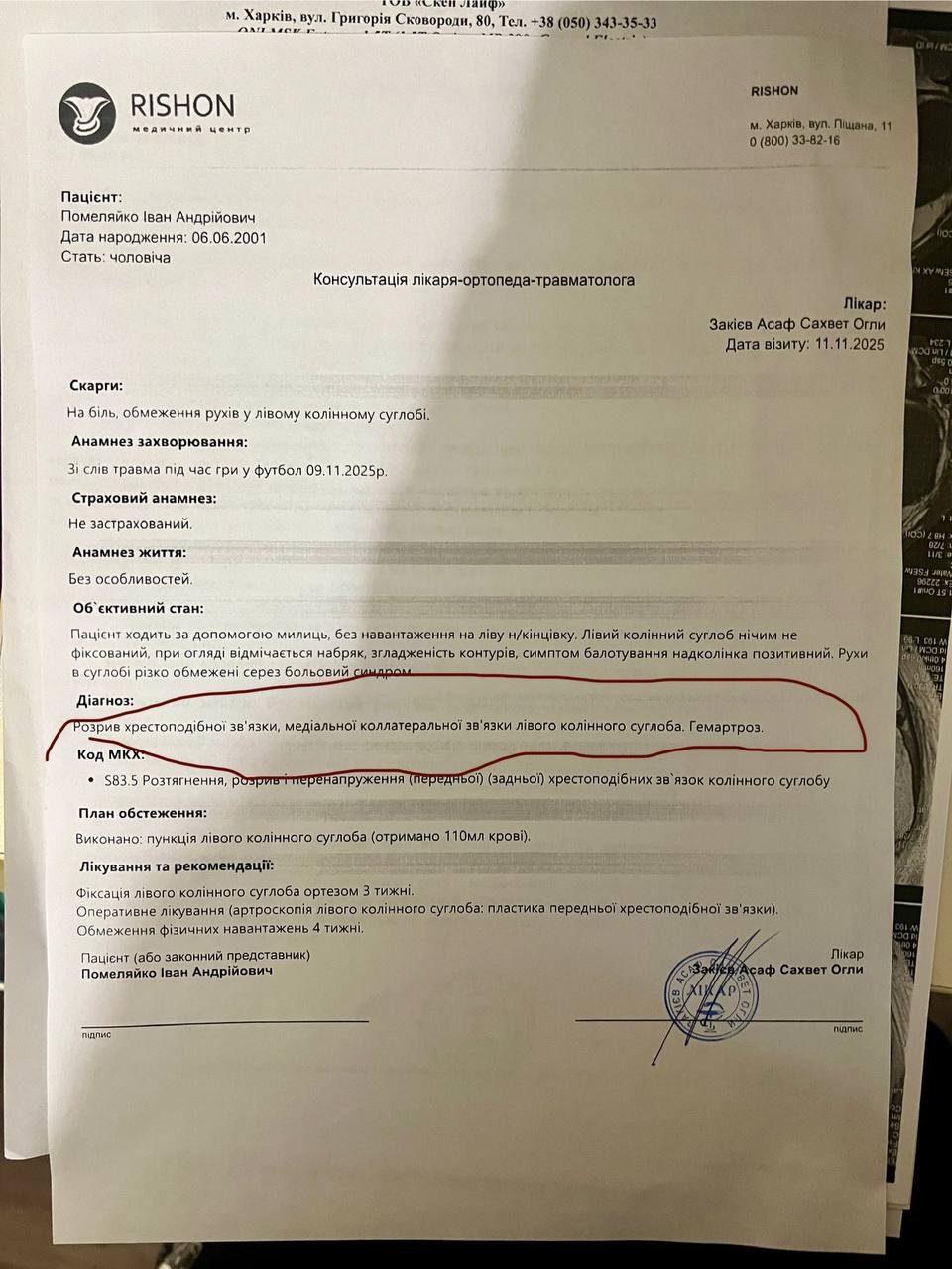 Гравець команди «Патріот» — Помеляйко Іван отримав дуже серйозну травму під час гри. Зараз йому потрібна термінова операція, вартість якої складає 80 000 гривень.